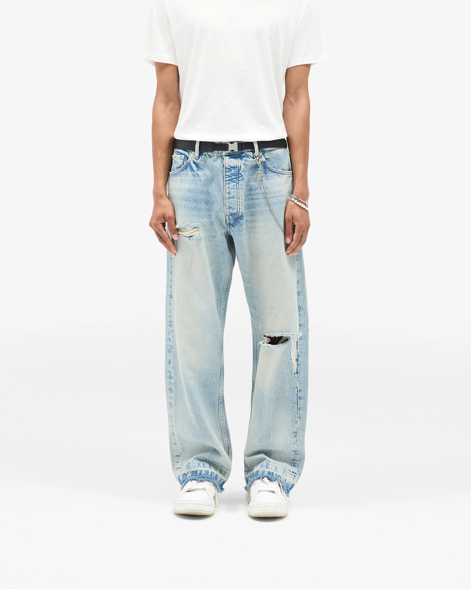 The Heaton Denim in Light Vintage Blue is part of the Heaton Capsule, designed by George and Michael Heaton. Constructed from heavyweight denim and built on a custom-developed fit, this style features a straight leg with added volume toward the hem. The fabric is heavily washed for a vintage fade and finished with hand-applied distressing and raw hems.